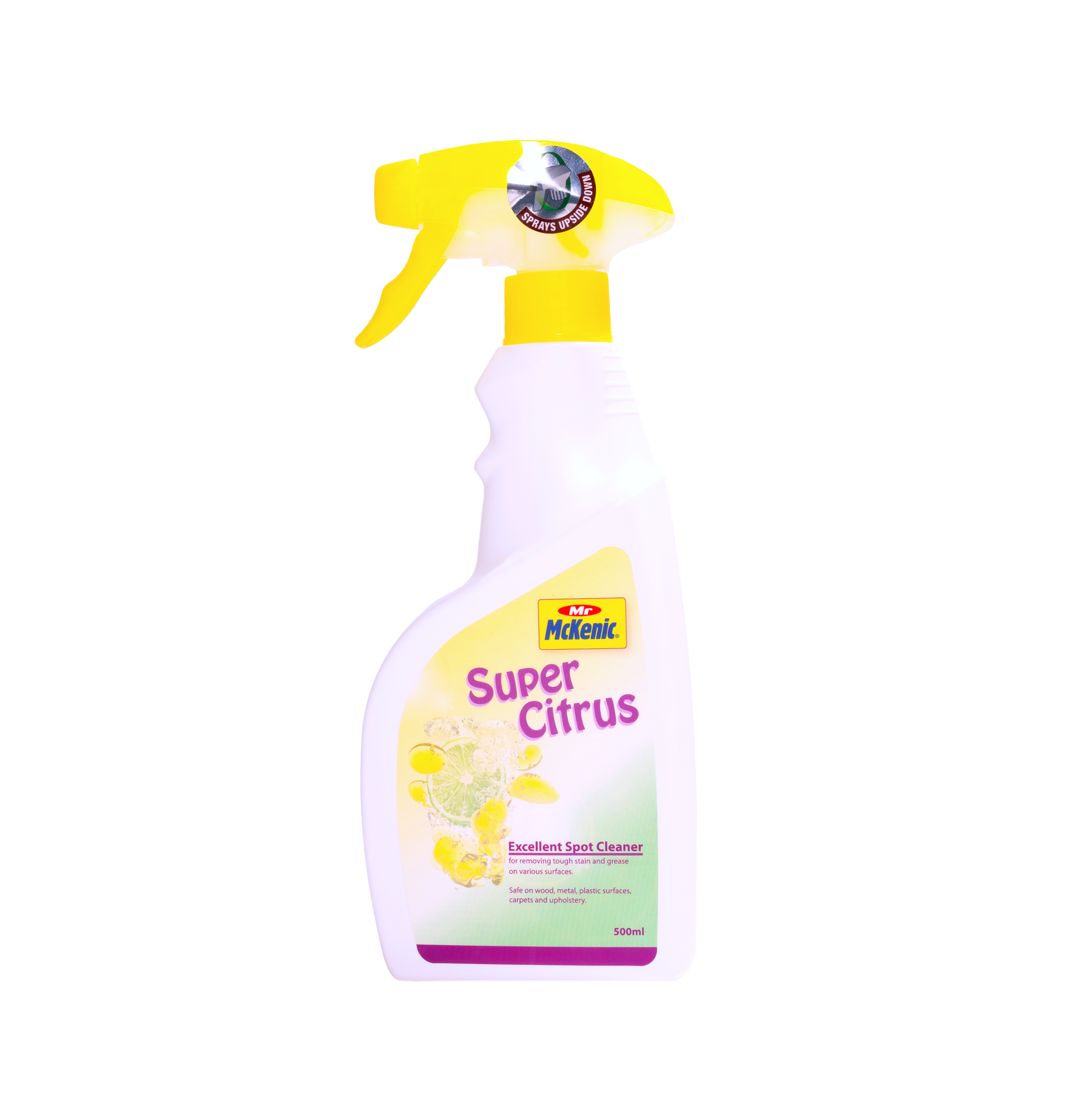 Mr McKenic® Super Citrus is a excellant spot cleaner formuated to removed stubborn stains from most surfaces. It can remove stubborn stains left by crayons, marker pens, chocolate, sauces, etc. It works on all surfaces, including fabrics and carpets.