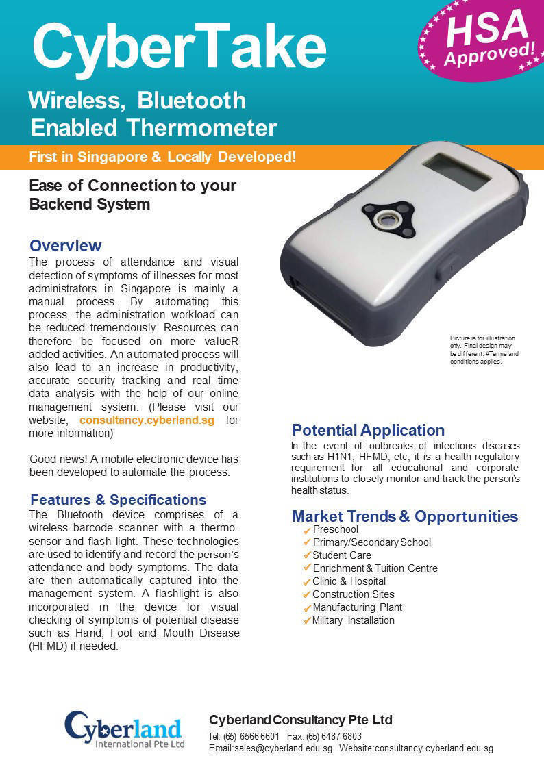 Cybertake is a Wireless barcode and temperature scanning device, which Kindergarten or Childcare Centre can deploy to help to scan students' BC [birthcetificate] into SafeEntry for contact tracing purposes. Besides scanning the BC of the students, they can also use this same device to check the students’ temperature and do visual screening before allowing them to enter the school premises. As this is a Bluetooth device, it is mobile and can be connected to all smart devices such as Notebook, Tablet or phone.