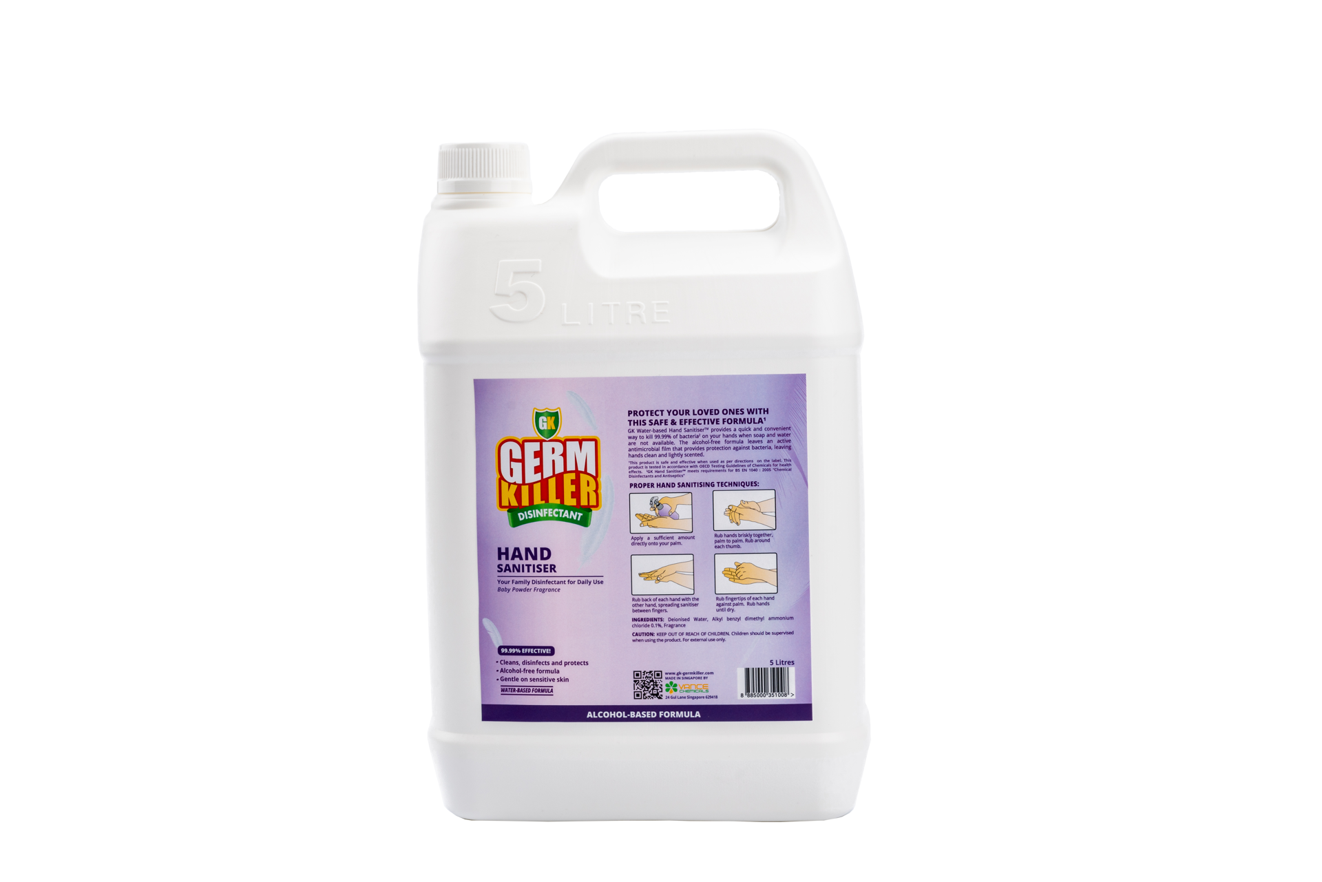 GK Hand SanitiserTM features water-based hand sanitiser formulated for daily use to protect you and your loved ones. It provides a quick and convenient way to clean your hands without soap and water. Since GK Hand SanitiserTM is alcohol-free, it does not dry out hands or irritate sensitive skin, making it suitable for daily use.